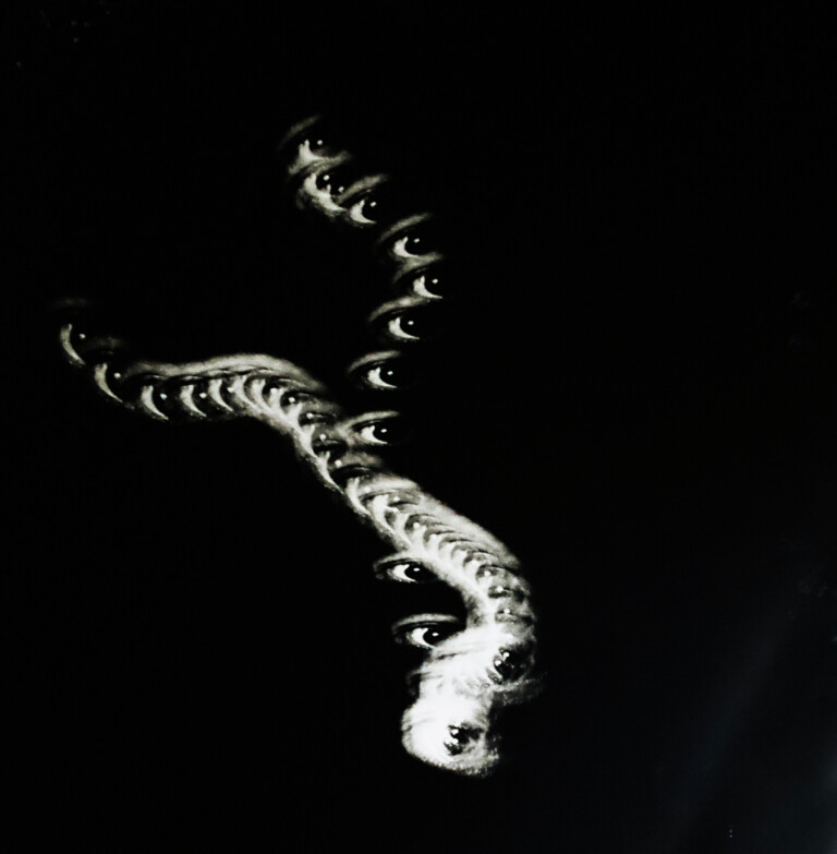Fotografía de dibujo hecho con polvo de alas de mariposa sobre papel fotográfico: Impresión Lambda