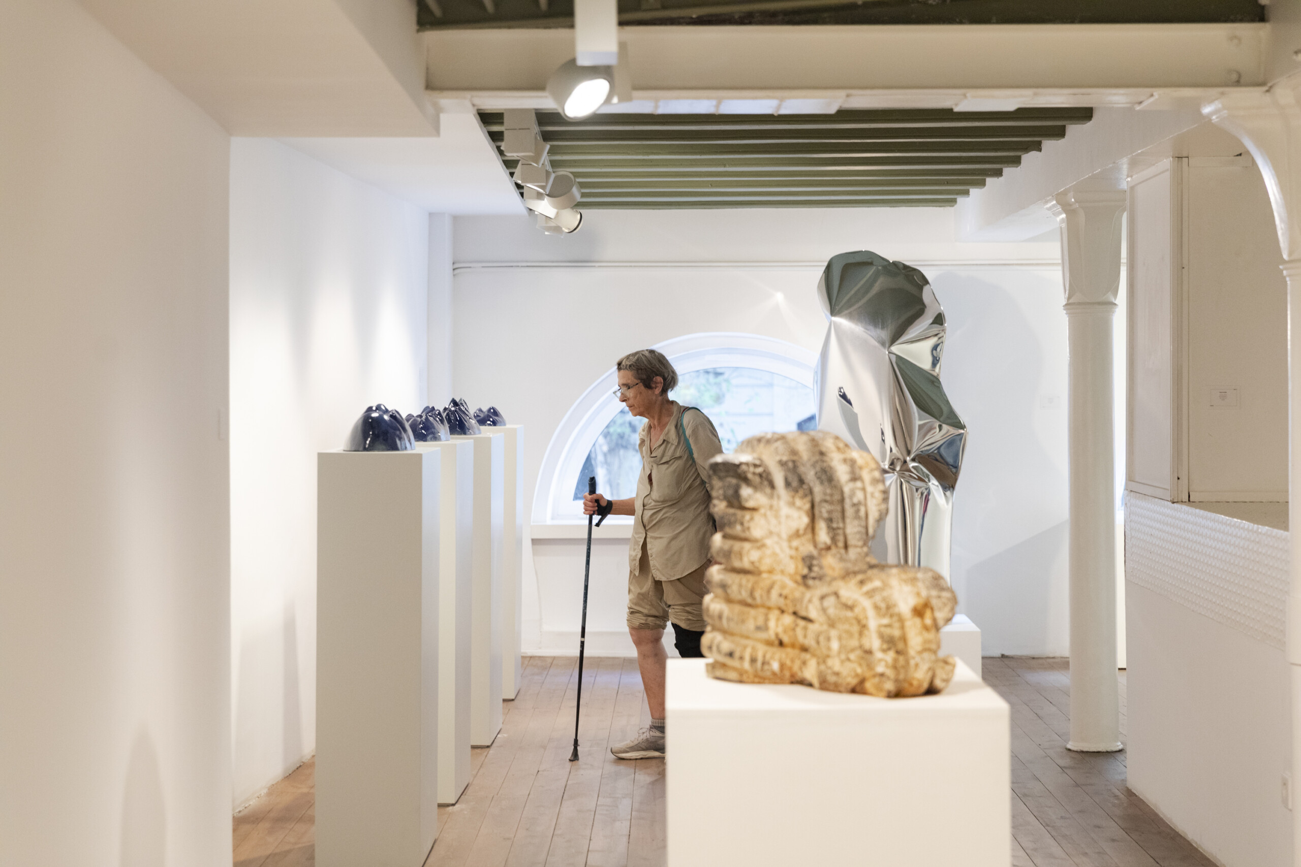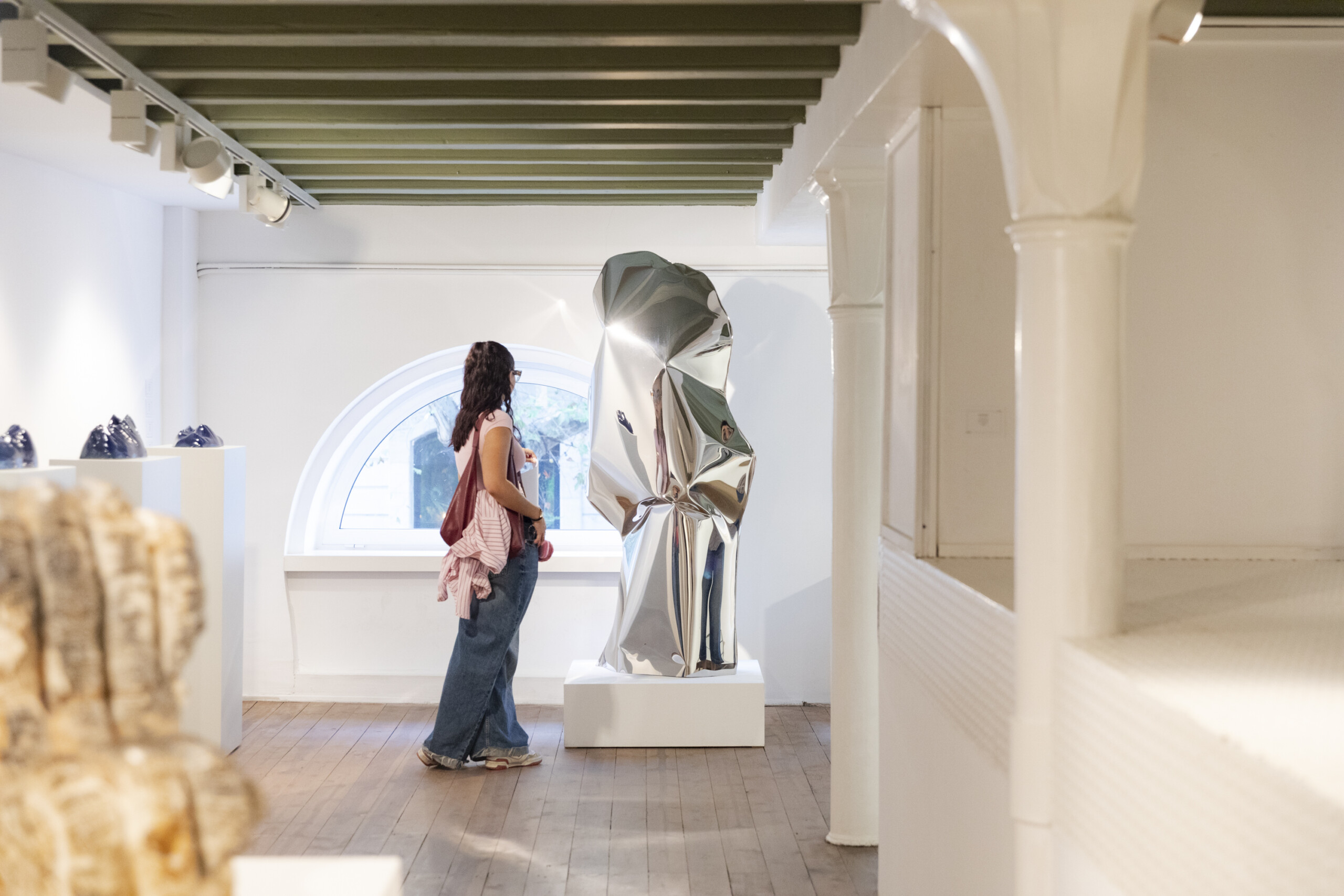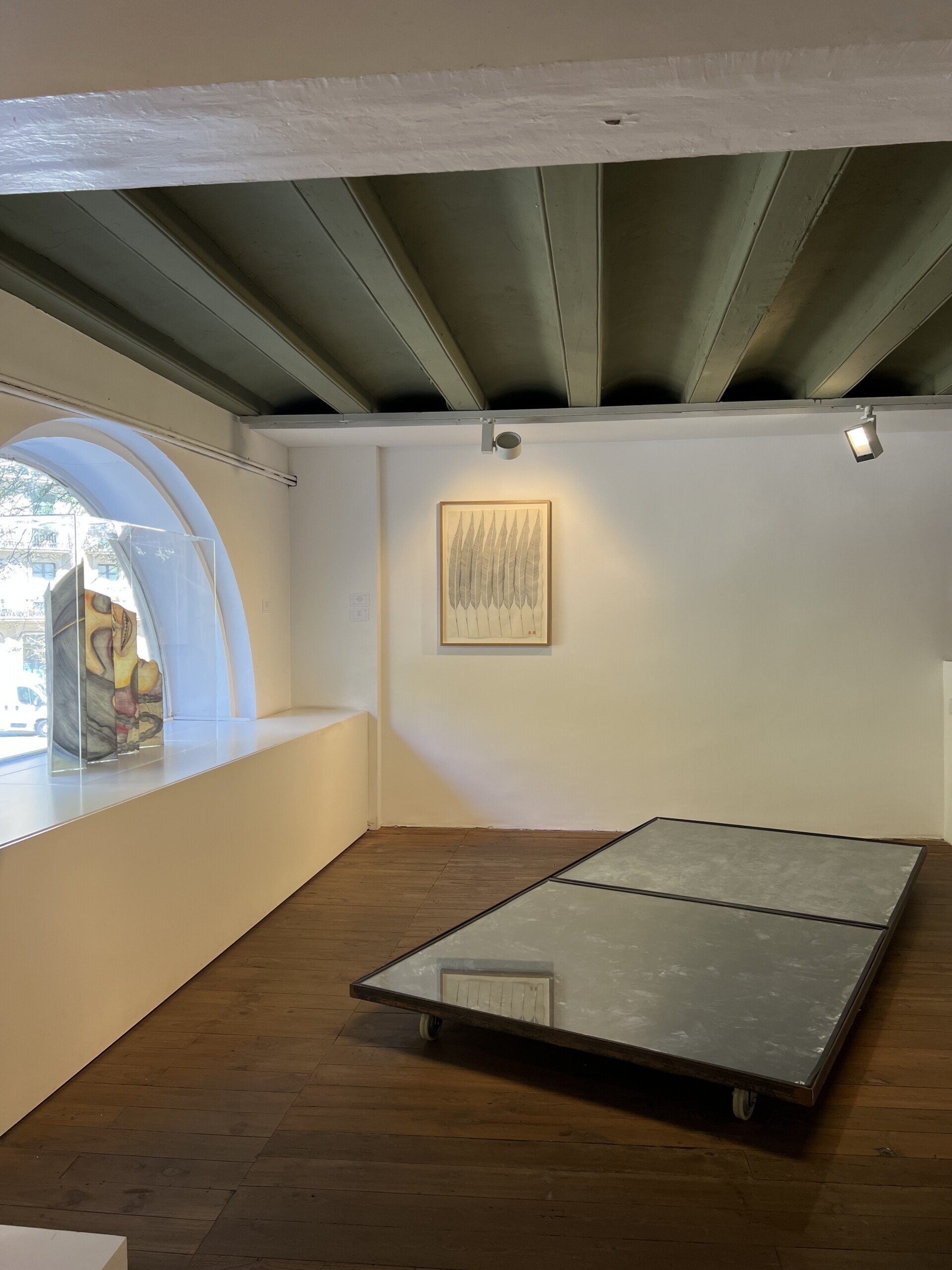 Las plumas de Elena del Rivero, suspendidas como cartas que vuelan, se pueden interpretar como mensajes frágiles en tránsito. Flying Letter #24 parece escrita para alguien que nunca llegará a leerla, pero su movimiento mantiene vivo el intento de comunicación. Contiguo, un menhir de acero inoxidable de irrumpe como un sueño lúcido: una presencia vertical, espejo y umbral. La obra de Gonzalo Guzmán nos sugiere una piedra imposible, brillante, que nos recuerda que toda historia necesita un lugar donde detenerse a pensar.