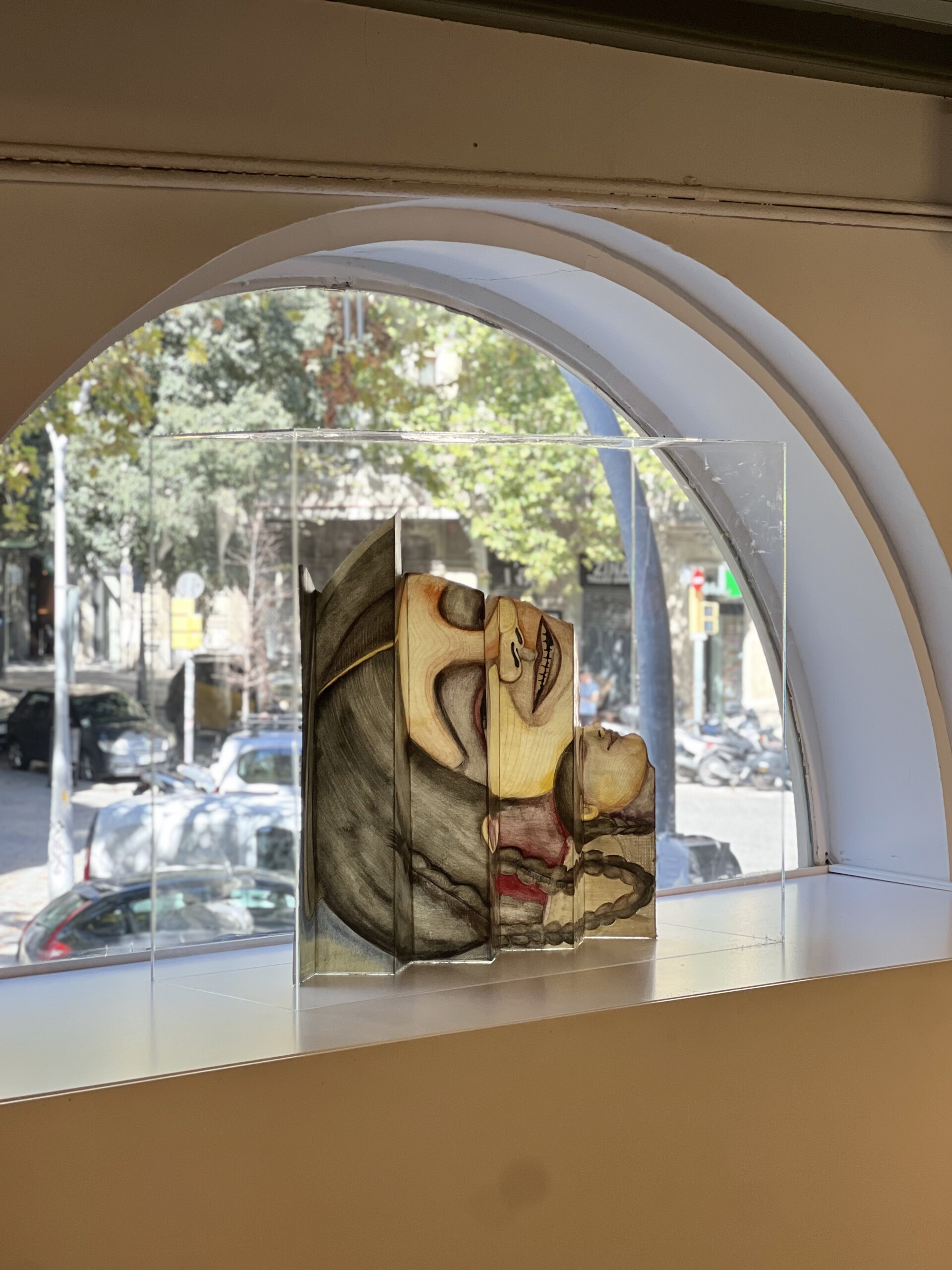 Cerca, el hierro de Jaume Plensa condensa el peso de lo humano en lo abstracto. Su CAP III nos evoca cabeza y silencio, masa y pensamiento. Una pieza que no explica literalmente, pero contiene: como si guardara en su interior el secreto del relato que aún no sabemos leer. En el suelo, la estructura de Susana Solano que evoca espacios transitados, así como la campana de Evru/Zush que guarda en su interior la resonancia de todos los sonidos que han sido y de aquellos que aún pueden ser escuchados.