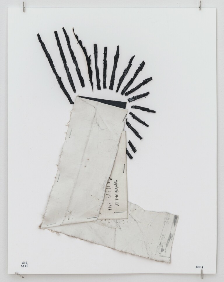 Collage con fragmentos de lino y pintura al óleo sobre lino, hilo, grapas y tinta sobre cartón de museo.