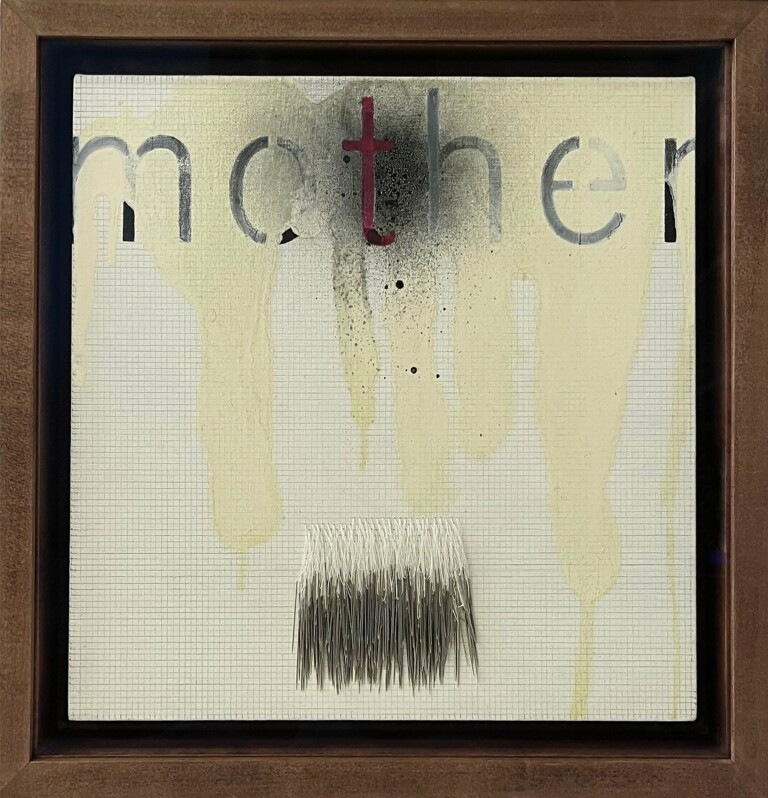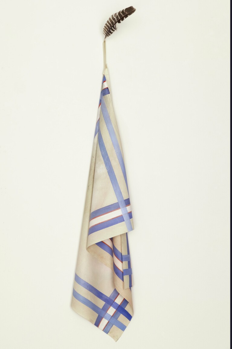 Acrílico sobre lienzo imprimado y sucio con bucle de lona cosido, una aguja y una pluma